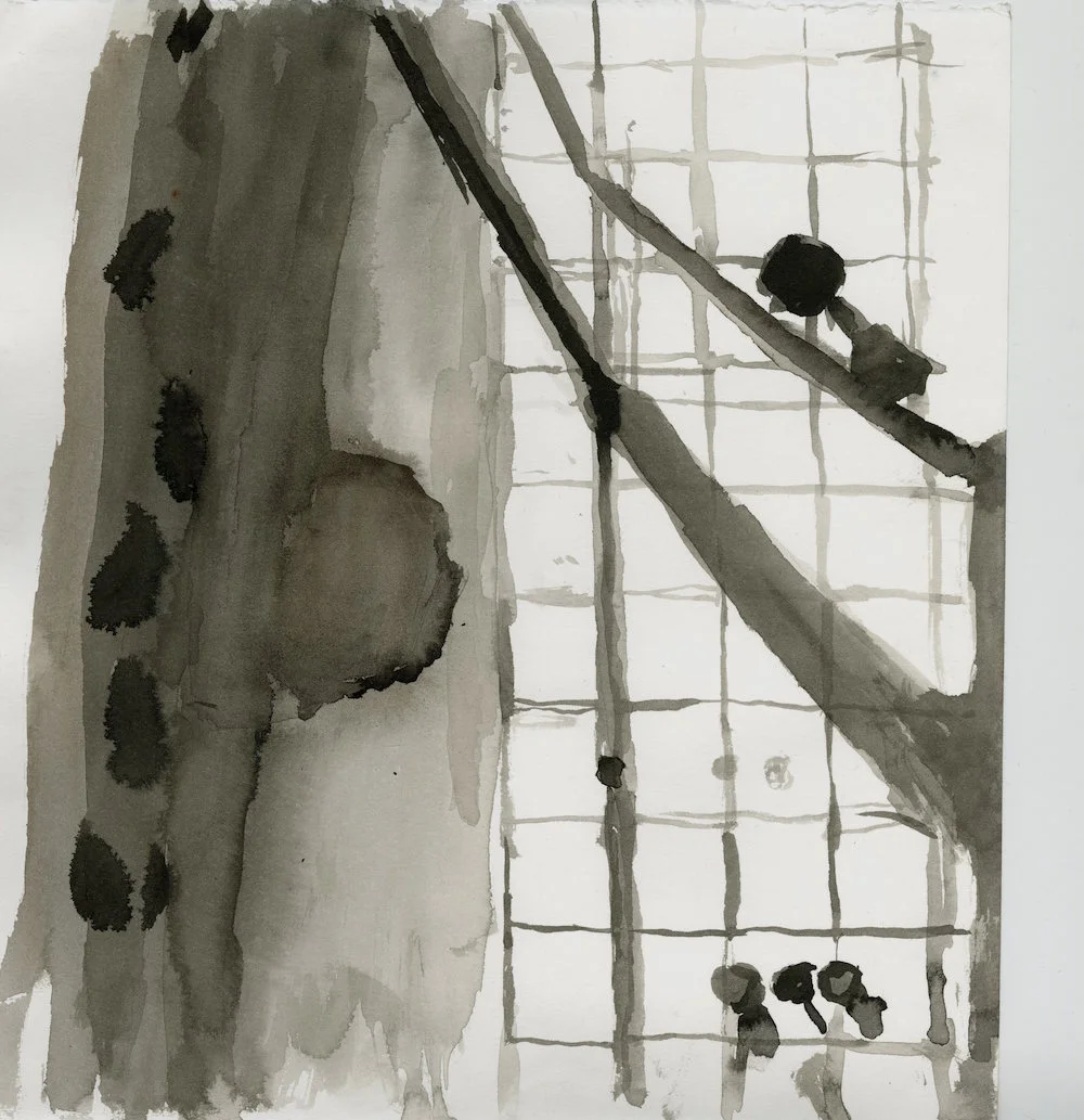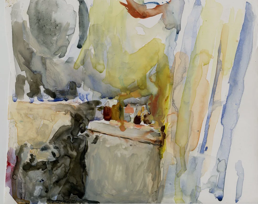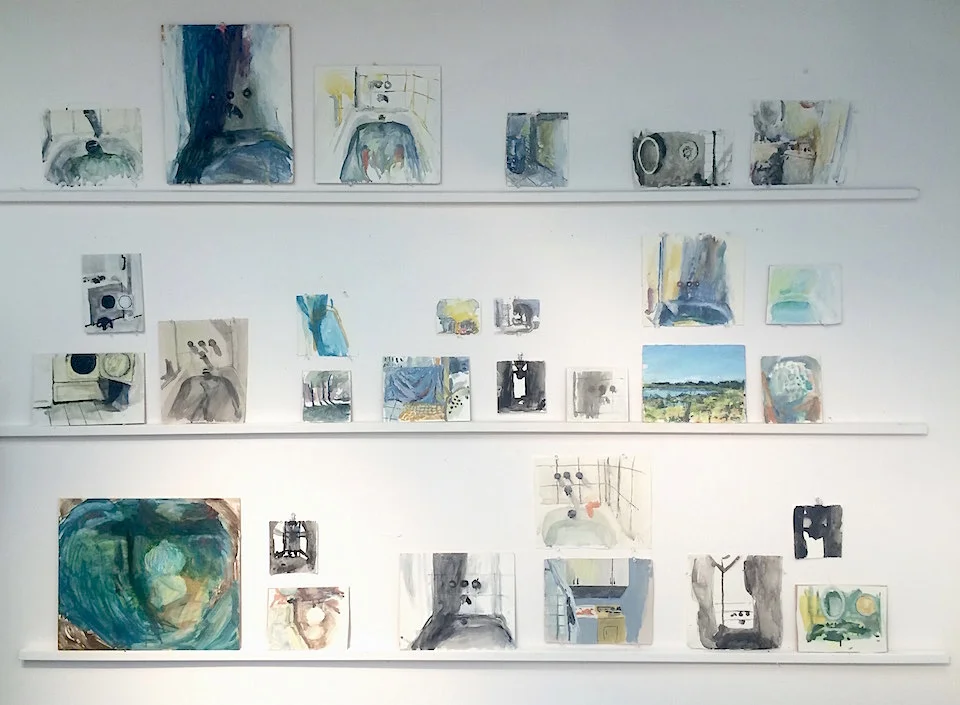 This series was painted almost entirely in my bathtub or bathroom. It began as a way to continue painting right after the birth of my daughter. I was surprised to find the constraints of this series, such as time, water, and gravity, helped me focus, and in the end to see in a different way. I found many similarities between this project and painting plein air. As plein air painting is captured in the moment, I wrote the following statement during my painting experience in the interest of capturing the space in my mind.